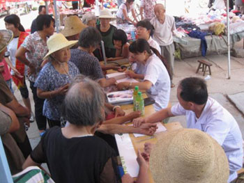 為了讓本次公益活動取得更大效果,義診小組特別選擇當?shù)厝丝诩械募虚_展本次活動。這天的天氣是夏日一貫的高溫炎熱,華都醫(yī)院醫(yī)務工作者們?nèi)讨崾铐斨胰眨诩猩线厼槿罕娍床。呄蛩麄冎v解健康知識,并對他們的健康問題耐心細致地一一作了解答。針對診療過程中發(fā)現(xiàn)的高血壓和傷風感冒等多發(fā)病,醫(yī)務工作者在群眾的日常生活習慣、飲食方式等方面對他們進行了指導。義診醫(yī)療隊還向群眾傳授了一些生活中的急救小秘方,發(fā)放了健康知識宣傳資料,并為生活困難的群眾免費發(fā)放了一些常用藥品,詳細告訴他們藥物的使用方法和用藥禁忌。